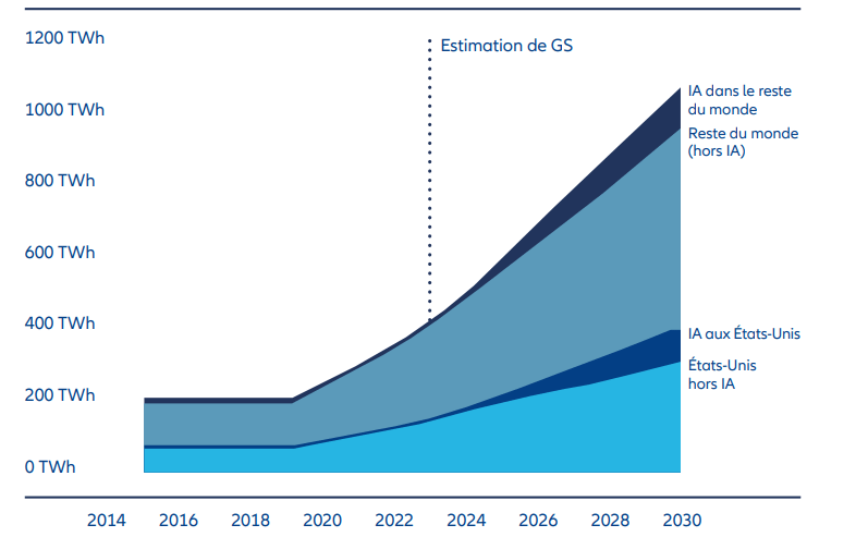 La multiplication des centres de données, des réseaux de fibres optiques, des antennes-relais de téléphonie mobile et des solutions informatiques se traduit par une augmentation de la consommation d’énergie. Certains actifs numériques exigent de plus en plus d’énergie, comme l’IA, etc. Par ailleurs, les bitcoins, etc., complètement inutiles, consomment plus d’énergie que certains petits pays.11 Un point essentiel à la transformation est de concilier la nécessité de la décarbonation avec l’accélération de la digitalisation. Les services et outils numériques tels que les compteurs intelligents peuvent également contribuer à une meilleure consommation d’énergie et faciliter les efforts de décarbonation. De nombreuses entreprises des GAFAM tentent de relever ce défi environnemental en concluant des accords avec des fournisseurs d’énergie renouvelable afin de les approvisionner en énergie verte. Une autre solution consiste à poursuivre le développement de solutions de refroidissement et de stockage à basse consommation d’énergie, ce qui pourrait déboucher sur d’autres opportunités d’investissement dans le secteur numérique adjacent.